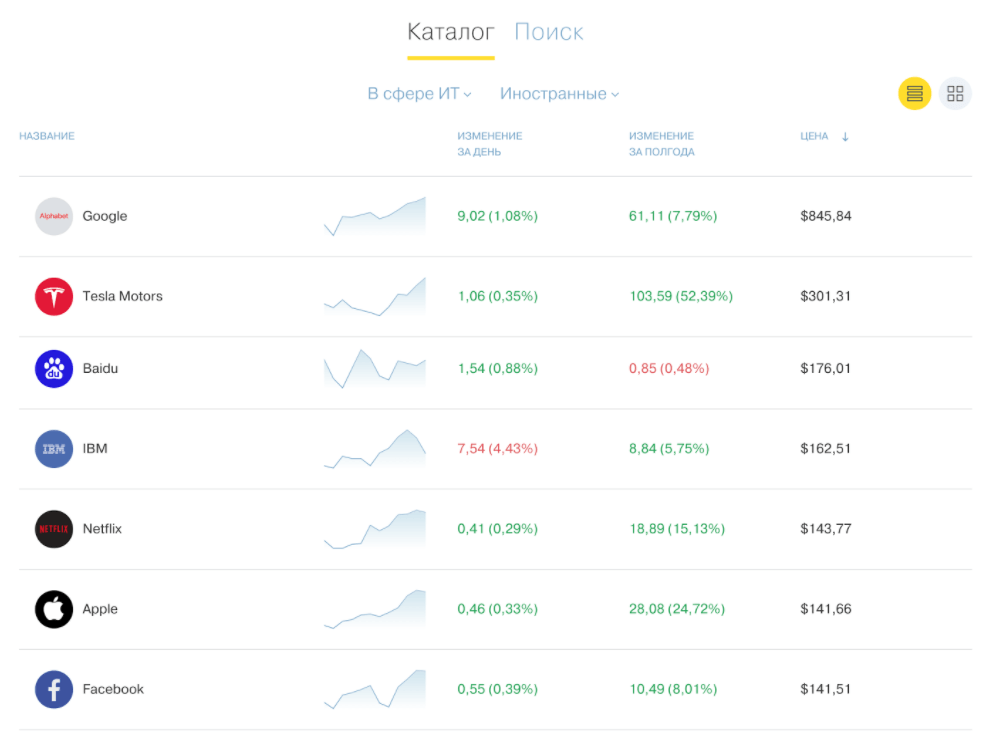 В каталоге компании рассортированы по сферам деятельности и стоимости акций.