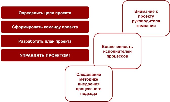 - Неправильная методология проведения организационных преобразований. Проведение организационных изменений требует специальных компетенций, знания методов проведения преобразований и умения их применять. Методика внедрения процессного подхода, излагаемая в наших статьях, дает возможность снизить риски этого проекта. Для этого нужно следовать “дорожной карте” и нашим рекомендациям.